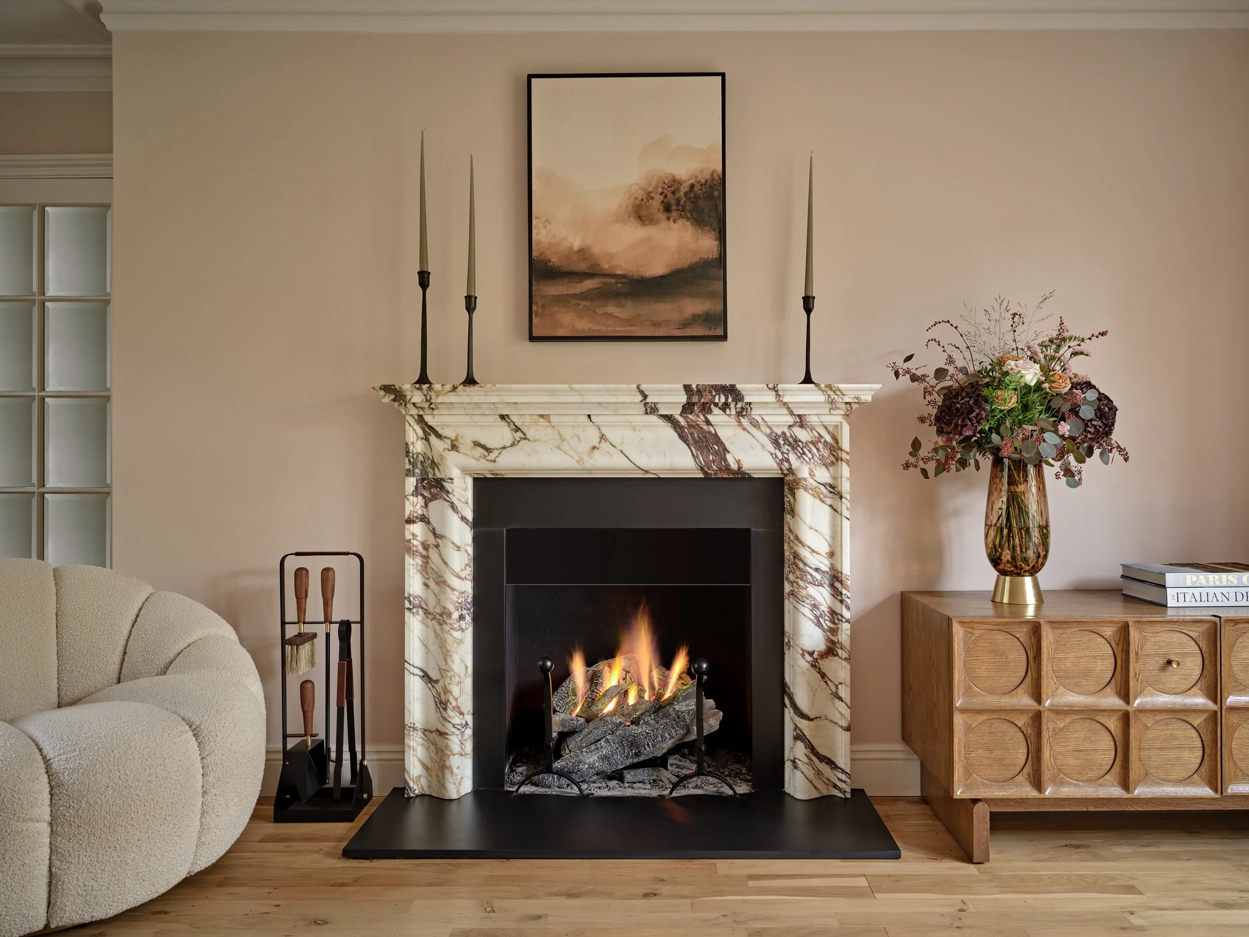 I wanted it to feel timeless — something that would anchor the room and bring a sense of calm and comfort but it can also feel energising. For me, a fireplace isn’t just about warmth; it’s about creating a focal point where people gather, where stories are shared, and where life happens. I wanted that sense of intimacy and beauty